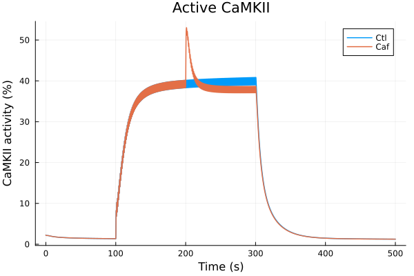 plot!(sol_nif_caf, idxs=i, lab="Caf + Nif", ylabel="CaMKII active fraction (%)", xlabel="Time (s)")