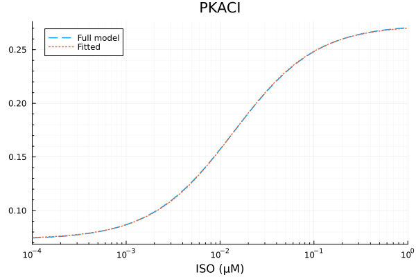 p1 = plot(xdata, [ydata predict(fit_pkac1)], lab=["Full model" "Fitted"], line=[:dash :dot], title="PKACI", legend=:topleft; xopts...)