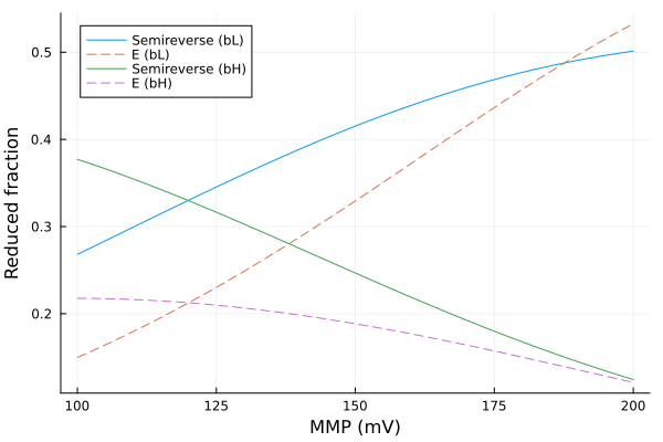 plot(xs, ys, xlabel="MMP (mV)", ylabel="Reduced fraction", label=["Semireverse (bL)" "E (bL)" "Semireverse (bH)" "E (bH)"], line=[:solid :dash :solid :dash]) |> PNG