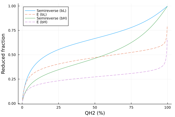 plot(xs, ys, xlabel="QH2 (%)", ylabel="Reduced fraction", label=["Semireverse (bL)" "E (bL)" "Semireverse (bH)" "E (bH)"], line=[:solid :dash :solid :dash])|> PNG
