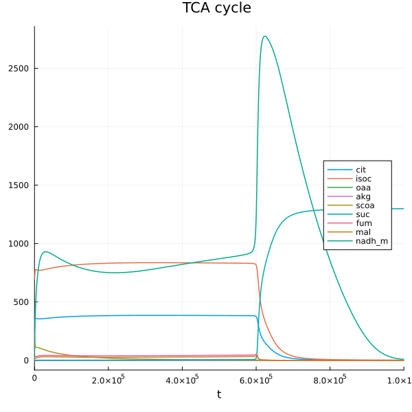 plot(sim[end], idxs=[cit, isoc, oaa, akg, scoa, suc, fum, mal, nadh_m], title="TCA cycle ", legend=:right) |> PNG