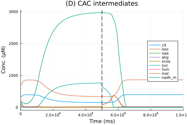 pl_cac = plot(sol, idxs=[cit, isoc, oaa, akg, scoa, suc, fum, mal, nadh_m], legend=:right, title="(D) CAC intermediates", xlabel="Time (ms)", ylabel="Conc. (μM)")