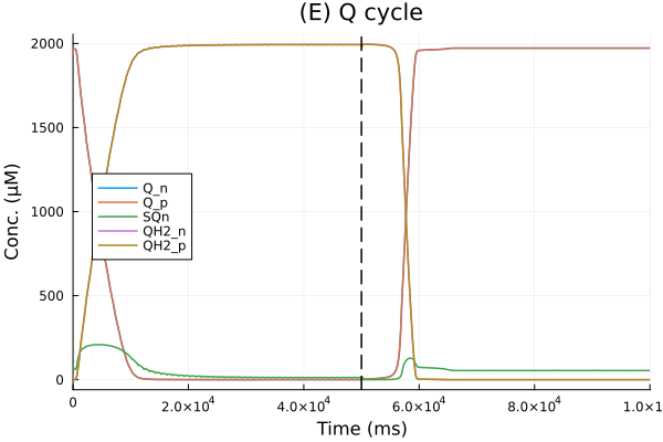 pl_q = plot(sol, idxs=[Q_n, Q_p, SQn, QH2_n, QH2_p], title="(E) Q cycle", legend=:left, xlabel="Time (ms)", ylabel="Conc. (μM)")