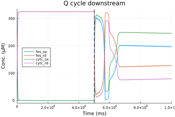 pl = plot(sol, idxs=[fes_ox, fes_rd, cytc_ox, cytc_rd], title="Q cycle downstream", legend=:left, xlabel="Time (ms)", ylabel="Conc. (μM)")