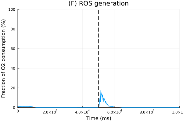 pl_ros = plot(sol, idxs=100 * sys.vROS / (sys.vO2 + sys.vROS), title="(F) ROS generation", lab=false, xlabel="Time (ms)", ylabel="Fraction of O2 consumption (%)", ylims=(0, 100))