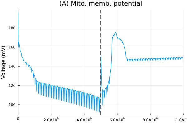 pl_mmp = plot(sol, idxs=dpsi, lab=false, title="(A) Mito. memb. potential", xlabel="", ylabel="Voltage (mV)")