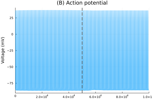 pl_vm = plot(sol, idxs=vm, lab=false, title="(B) Action potential", xlabel="", ylabel="Voltage (mV)")