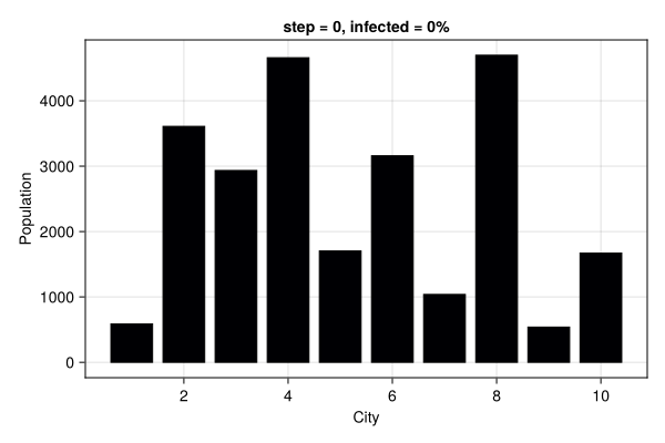 functioncreate_params(; C, max_travel_rate, infection_period =30, reinfection_probability =0.05, detection_time =14, death_rate =0.02, Is = [zeros(Int, C -1)..., 1], seed =2024,) rng =Xoshiro(seed) Ns =rand(rng, 50:5000, C) ## City population β_und =rand(rng, 0.3:0.02:0.6, C) ## Undetected transmission β_det = β_und ./10## Detected transmission (set to 10% of undetected)# Migrate from city i to city j# People in small cities tend to migrate to bigger cities migration_rates =zeros(C, C)for c in1:Cfor c2 in1:C migration_rates[c, c2] = (Ns[c] + Ns[c2]) / Ns[c]endend# Normalize migration rates maxM =maximum(migration_rates) migration_rates = (migration_rates .* max_travel_rate) ./ maxM# Migrate to self = 1 migration_rates[diagind(migration_rates)] .=1.0 params = (; Ns, β_und, β_det, migration_rates, infection_period, reinfection_probability, detection_time, death_rate, Is )return paramsend