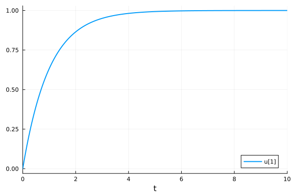 ODEProblem((u, p, t) -> p * (1.0 - u), 0.0, 10.0, 1.0) |> solve |> plot