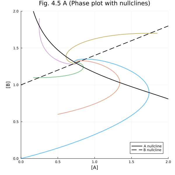 plot!(fig, xlim=(0.0, 2.0), ylim=(0.0, 2.0), legend=:bottomright, size=(600, 600), xlabel="[A]", ylabel="[B]")