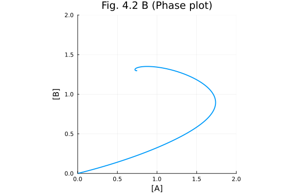plot!(fig, xlabel="[A]", ylabel="[B]", xlims=(0.0, 2.0), ylims=(0.0, 2.0), aspect_ratio=:equal)