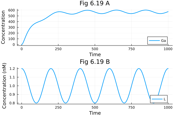 pl1 = plot(t-> sol619(t).Ga, 0.0, tend, label="Ga", xlabel="Time", ylabel="Concentration", title="Fig 6.19 A")