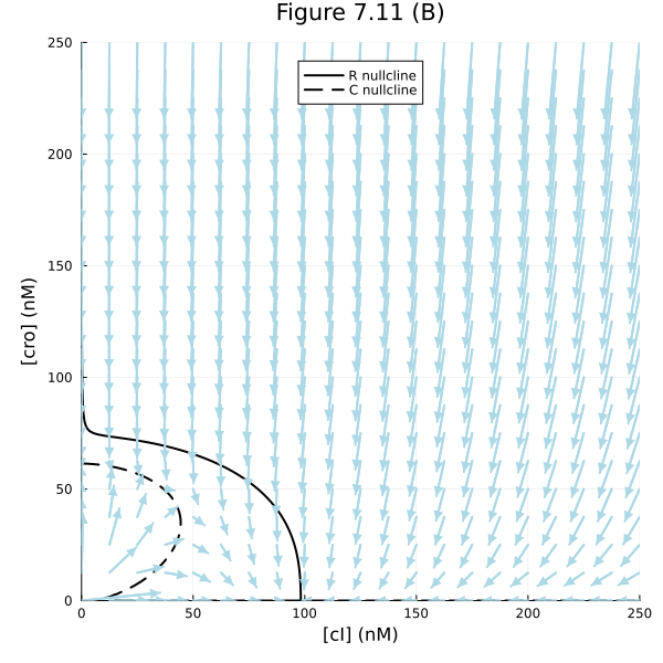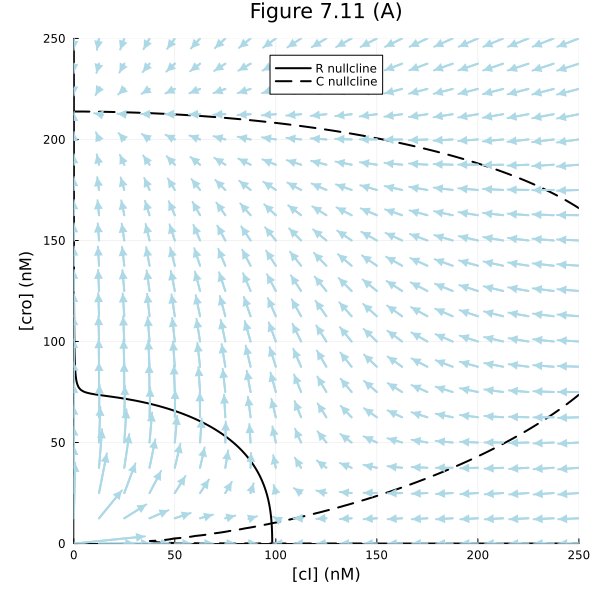 plot!(fig, xlims=(0, 250), ylims=(0, 250), xlabel="[cI] (nM)", ylabel="[cro] (nM)", aspect_ratio=:equal, legend=:top, size=(600, 600))