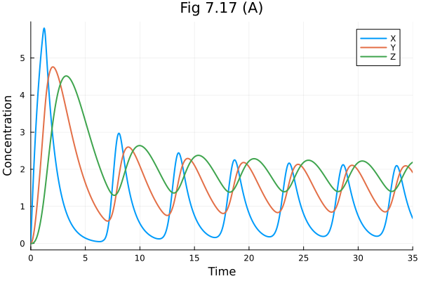 plot(sol, title="Fig 7.17 (A)", xlabel="Time", ylabel="Concentration", labels=["X" "Y" "Z"])