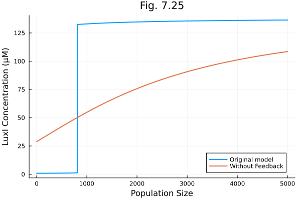 plot(npops, [luxI, luxI_nofeed], label=["Original model" "Without Feedback"], xlabel="Population Size", ylabel="LuxI Concentration (μM)", title="Fig. 7.25", legend=:bottomright)