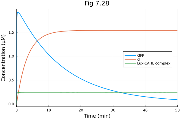 plt728 = plot(sol728, labels = ["GFP" "cI" "LuxR:AHL complex"], xlabel="Time (min)", ylabel="Concentration (μM)", title="Fig 7.28", legend=:right)
