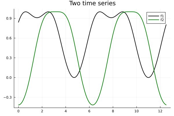 plot(xs, [f, f2], label=["f1" "f2"], linecolor=[:black :green], title="Two time series")
