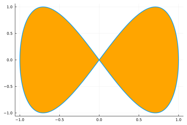 plot(xₜ, yₜ, 0, 2π, leg=false, fill=(0,:orange))